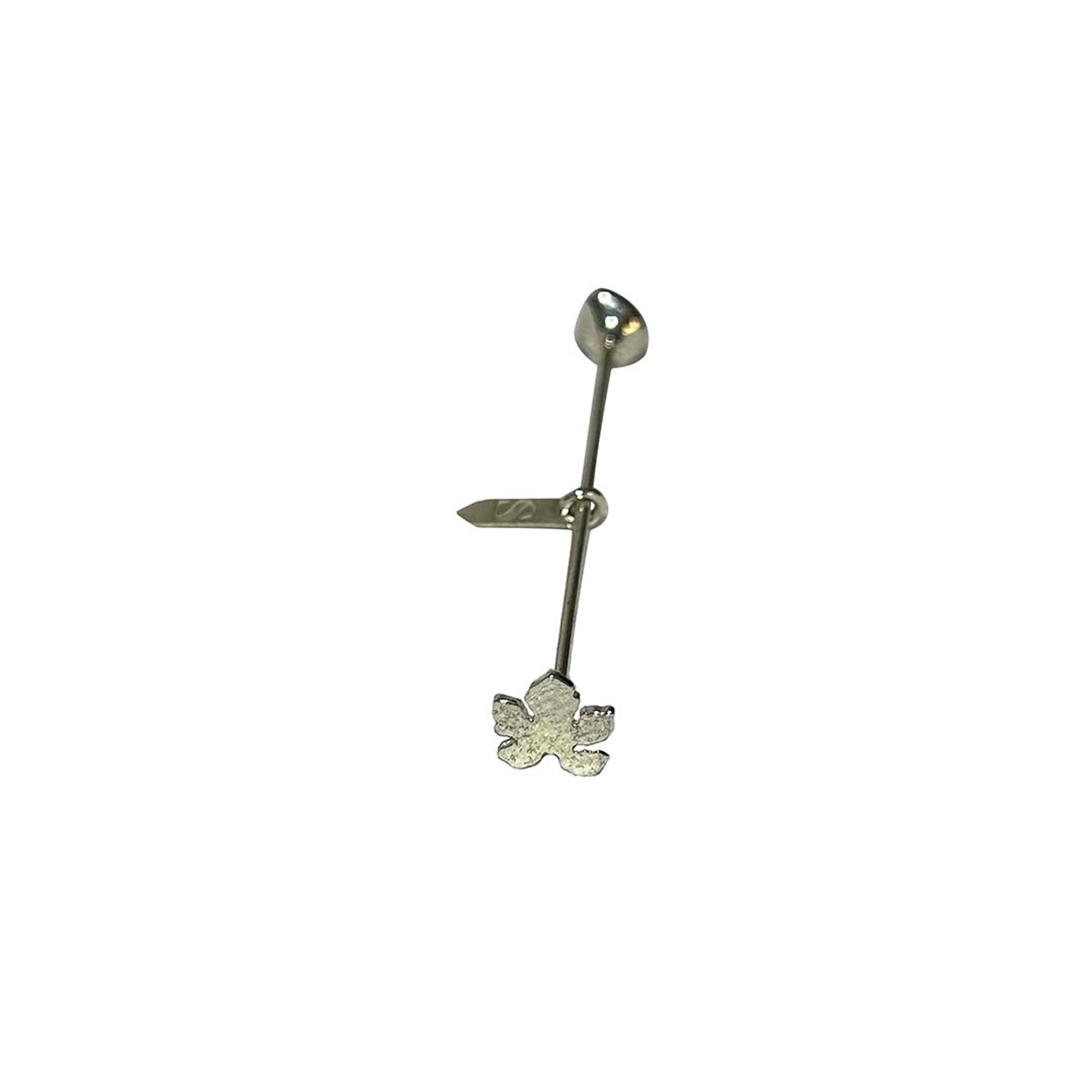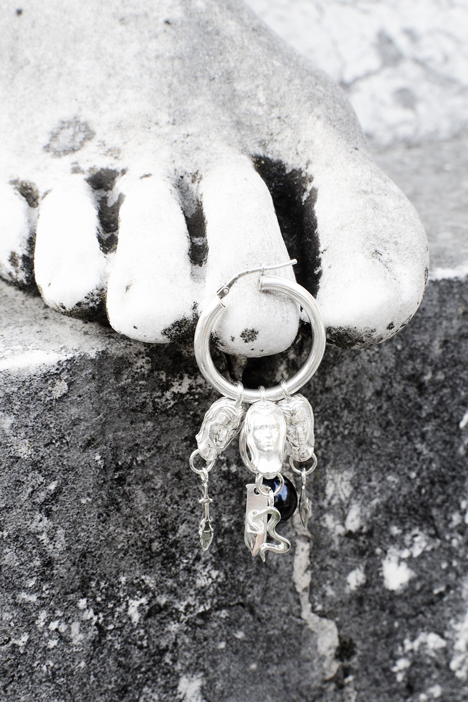 ECATE : silver single earring representing Ecate. The charms are condom shaped, with engraved logo and a natural black pearl.
