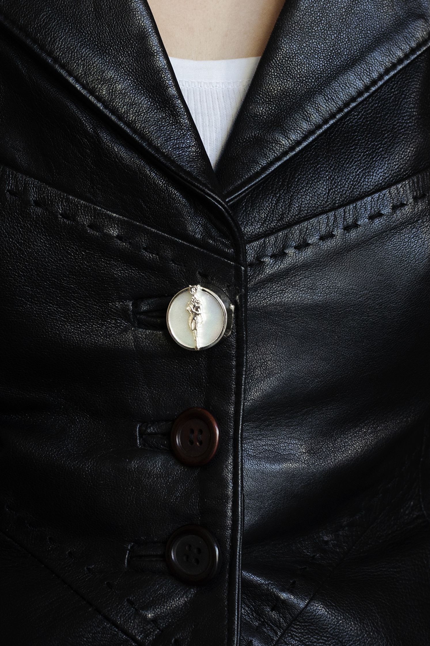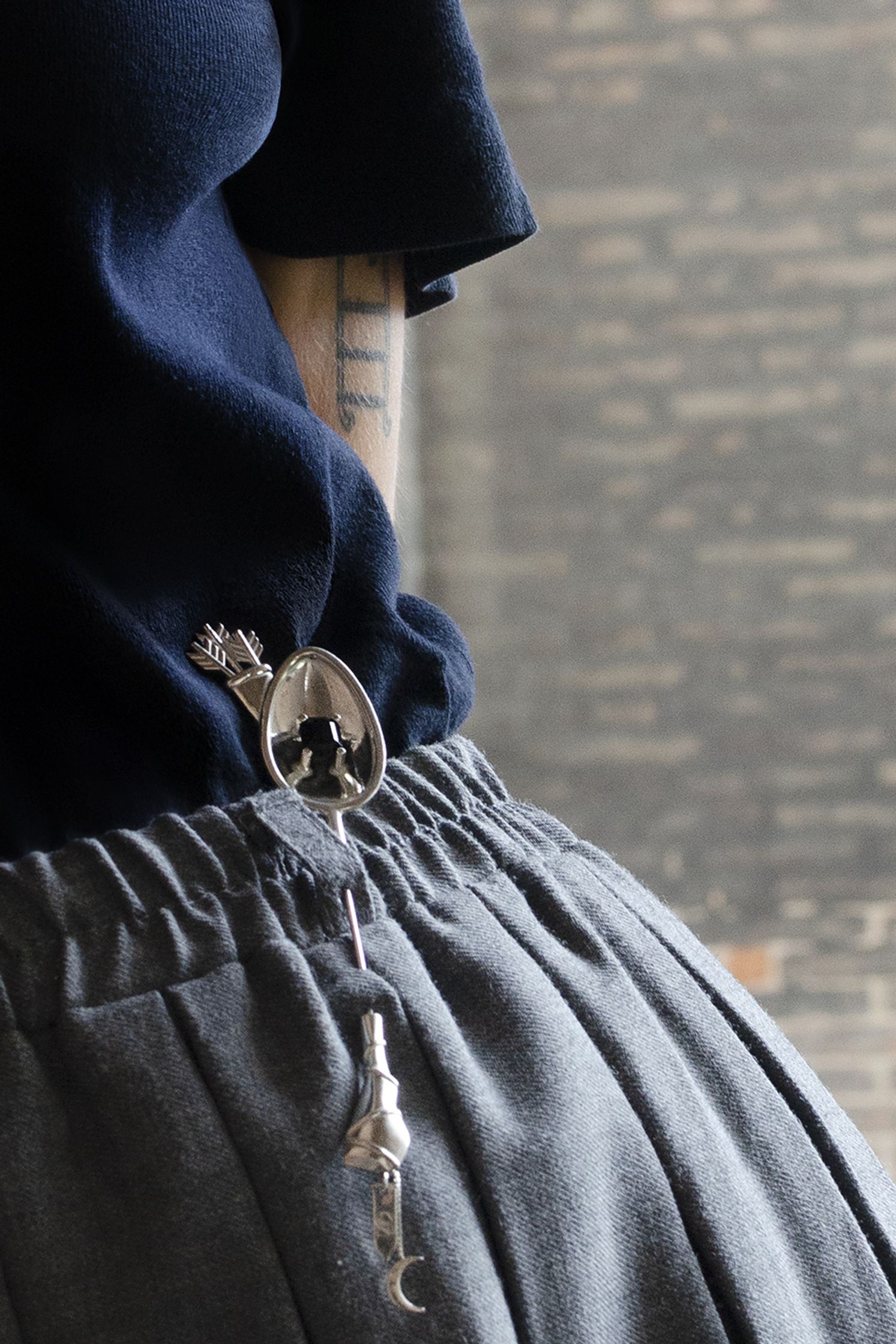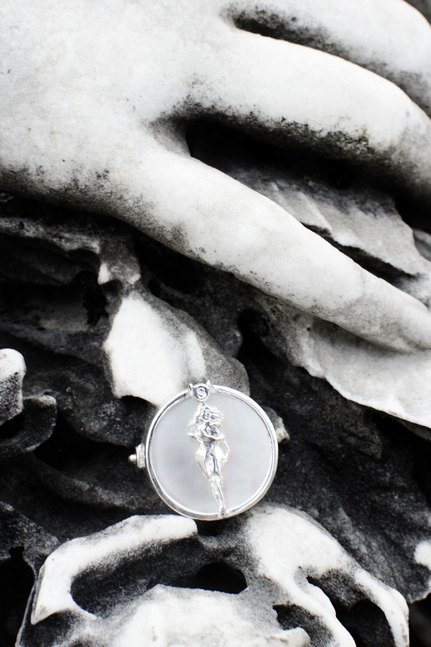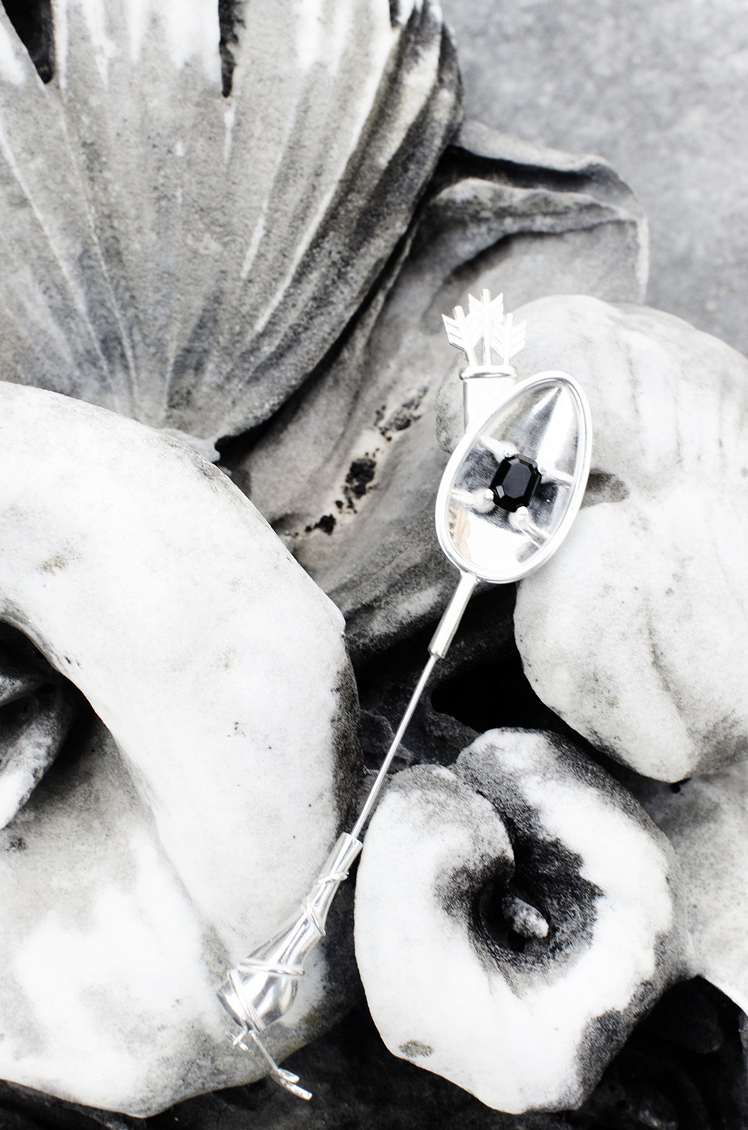 DIANA : silver brooch, with onyx stone. The shape resembles the wooden spoon, iconographically used by witches. On the back there are the quiver and arrows, symbols of Diana. There are two charms, half moon shaped and the condom shaped, where the logo is engraved.