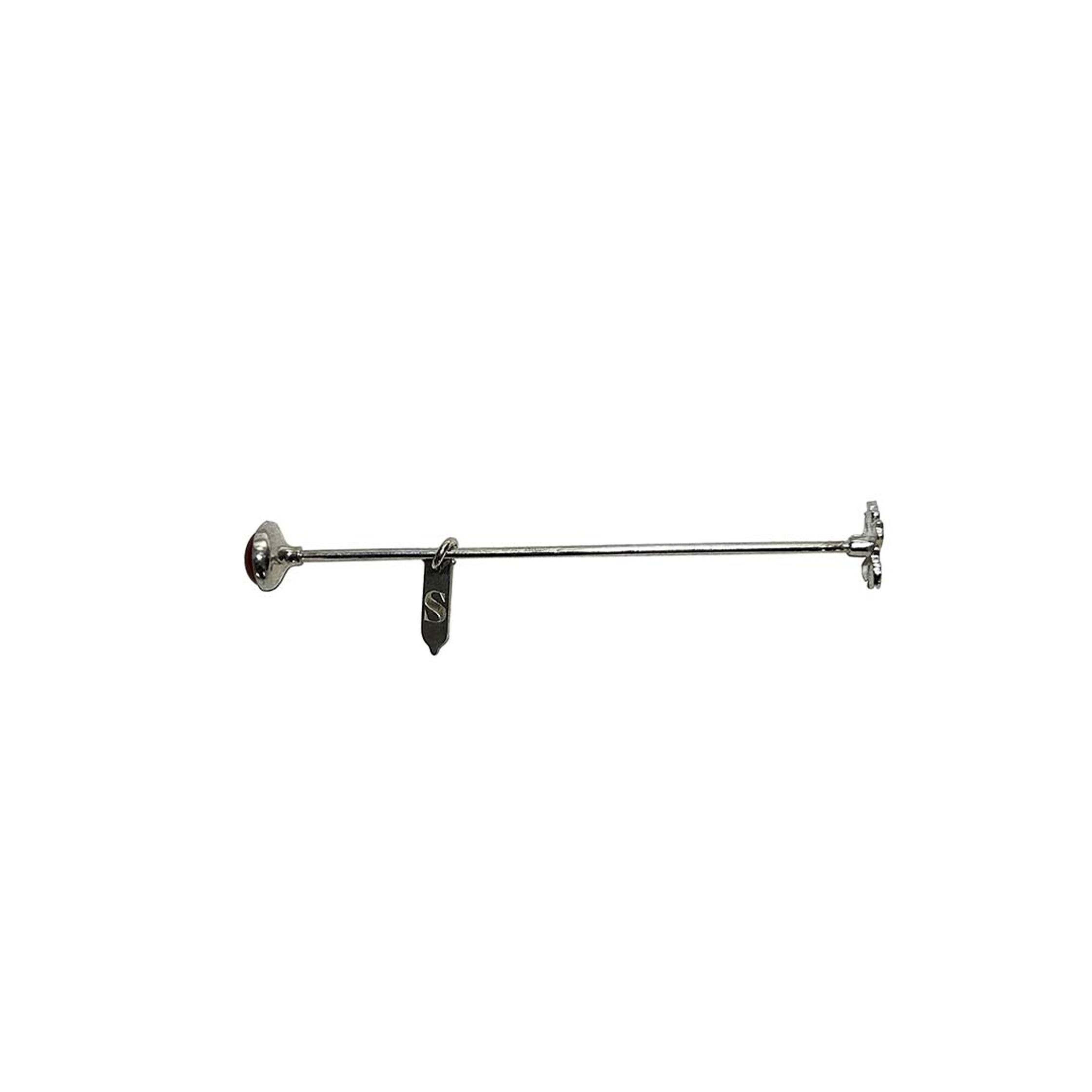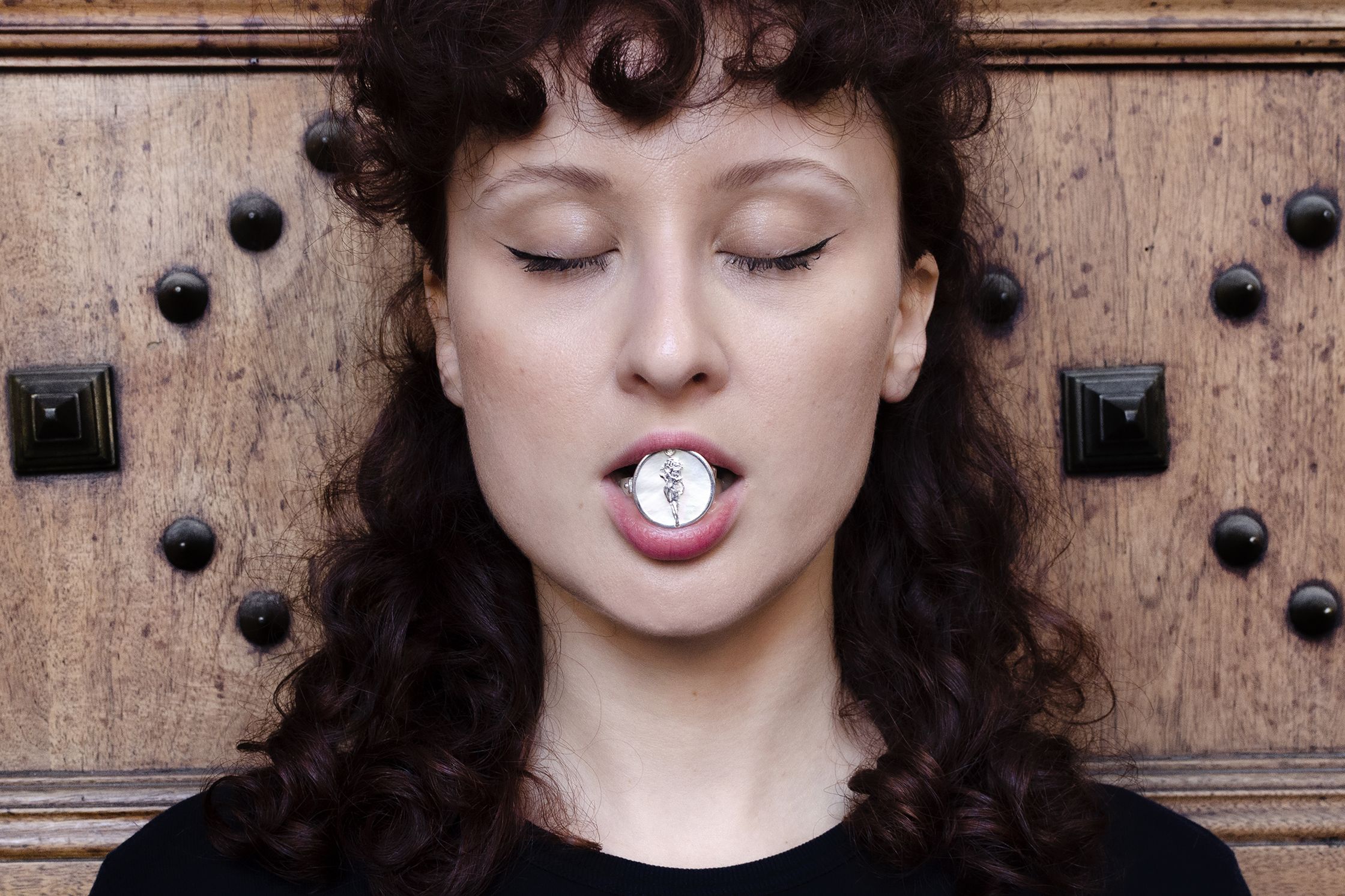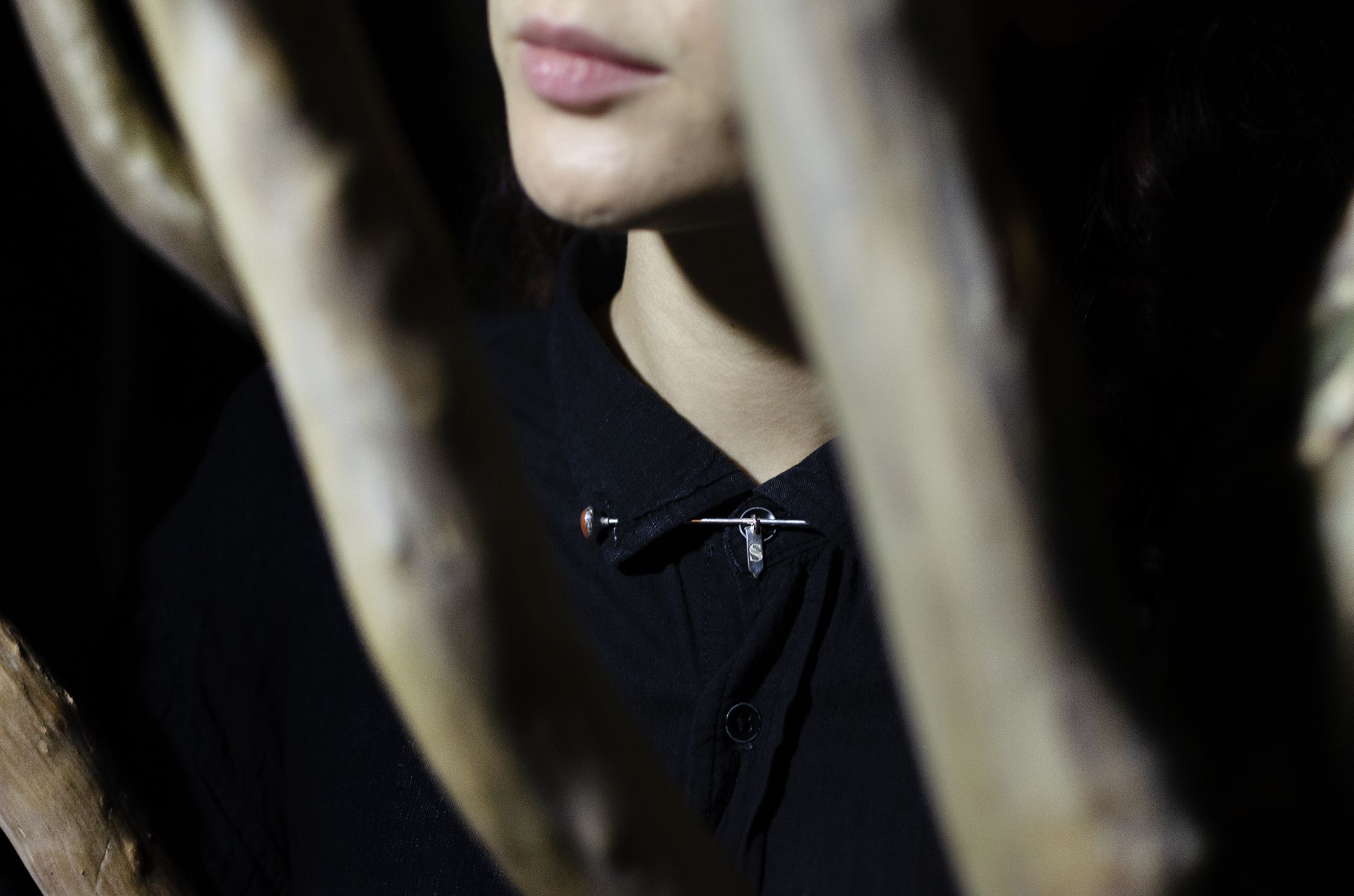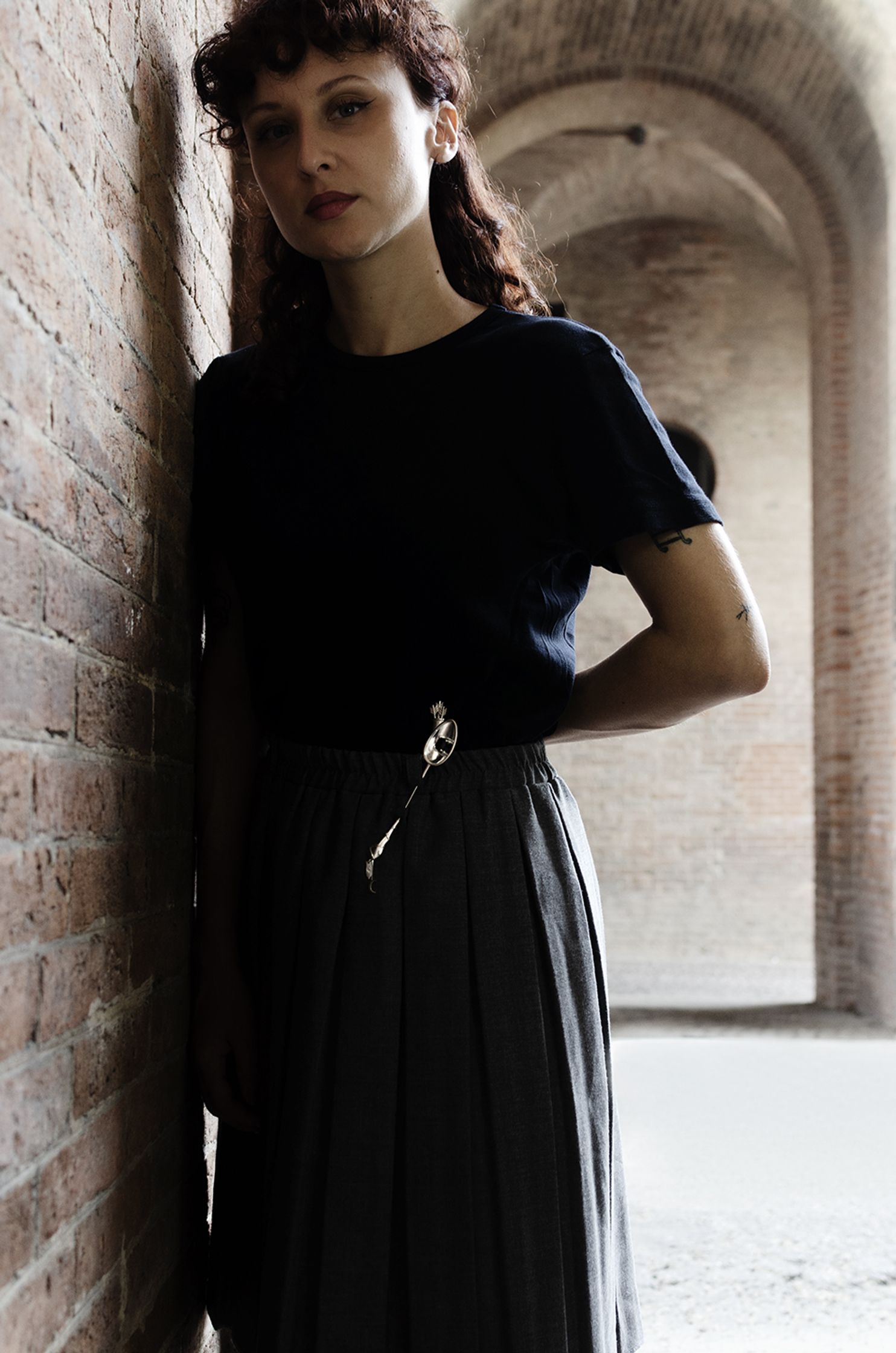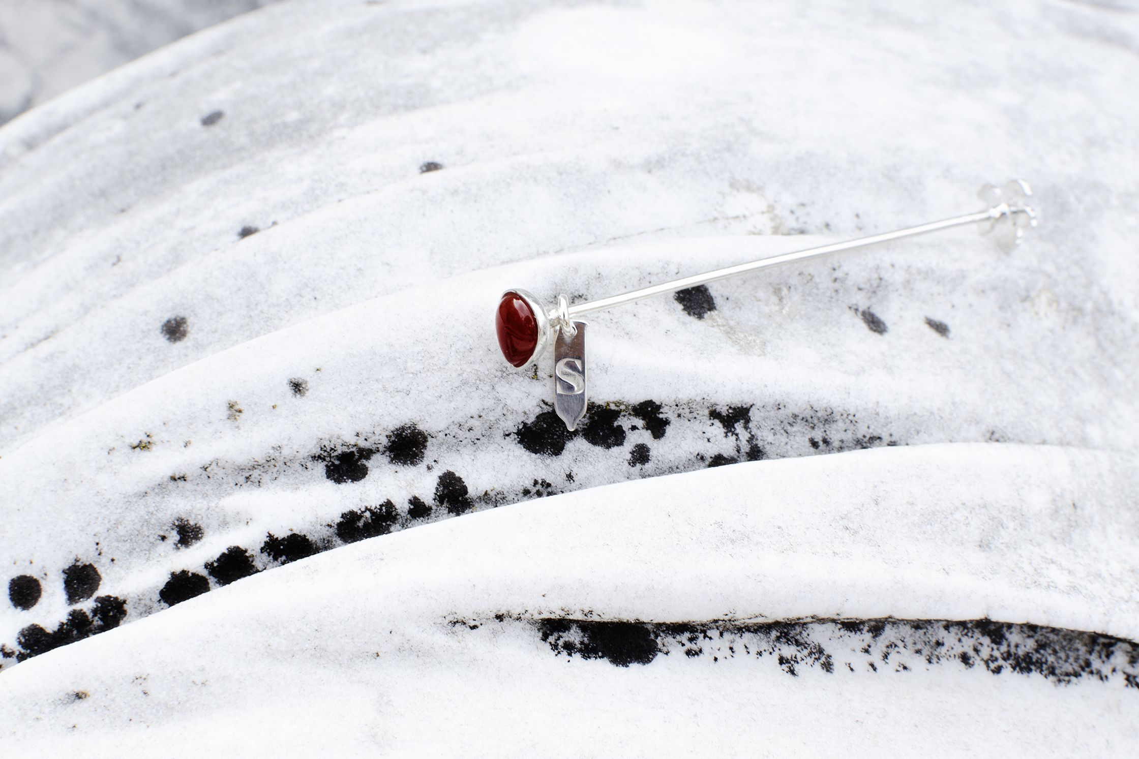DIANA : silver brooch, with onyx stone. The shape resembles the wooden spoon, iconographically used by witches. On the back there are the quiver and arrows, symbols of Diana. There are two charms, half moon shaped and the condom shaped, where the logo is engraved.