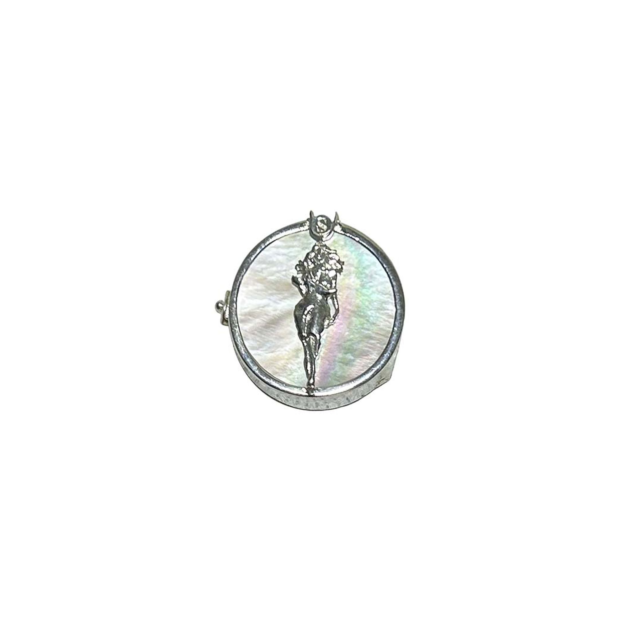ISIDE : button cover with Iside. It is made in silver. The Nacre stone represents the moon. The logo is engraved on Iside’s crown.